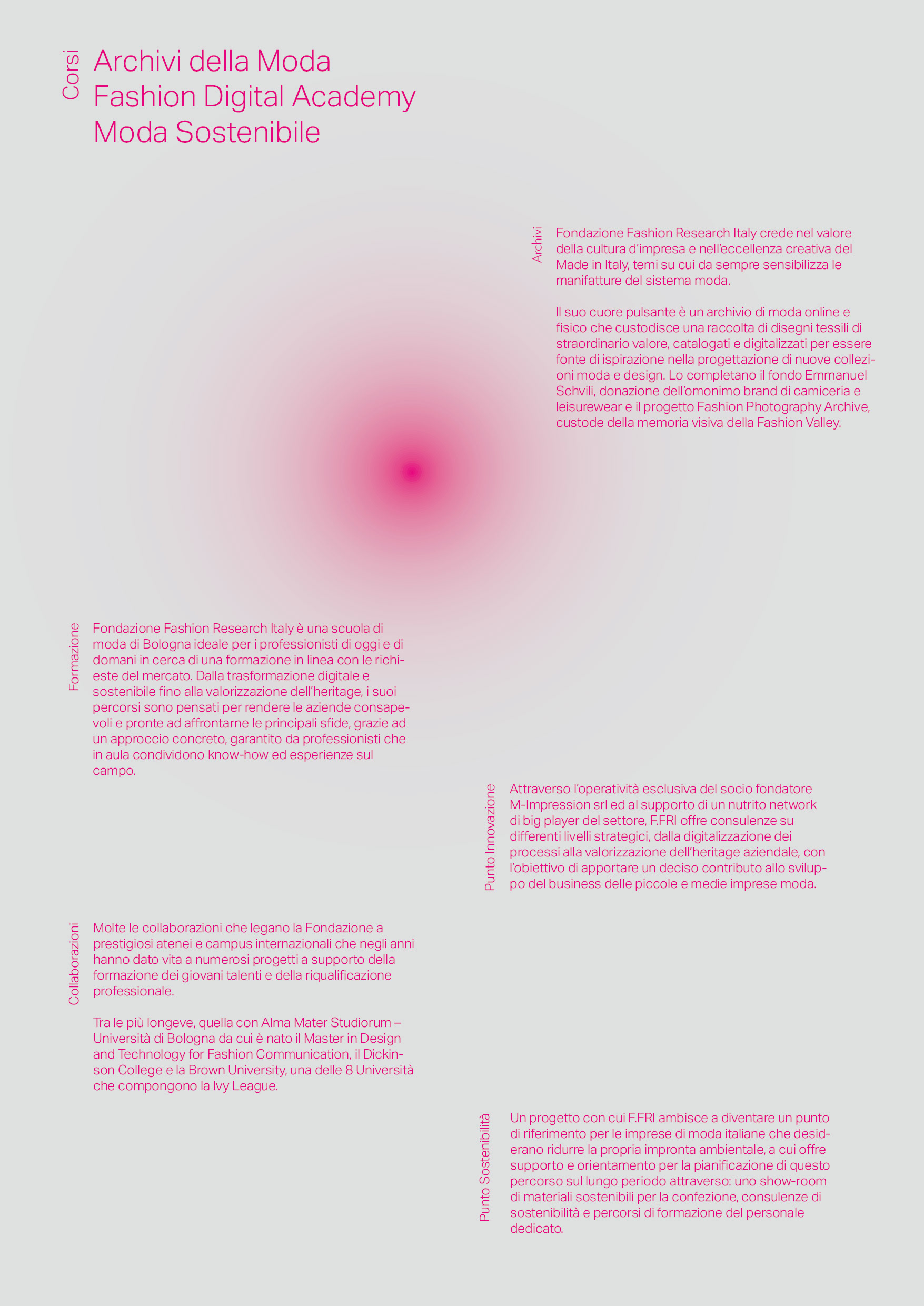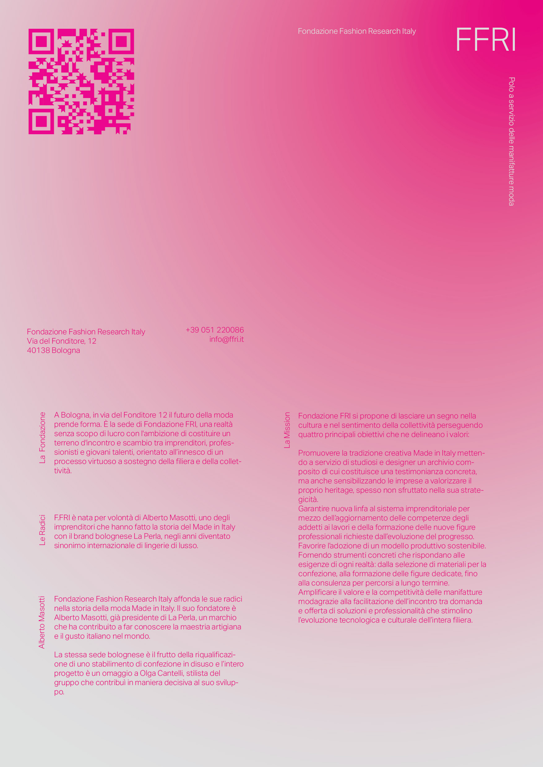 Fondazione Fashion Research Italy (FFRI) is a non-profit organisation dedicated to preserving and promoting Italy's textile and fashion heritage. As the graphic designer for FFRI, this project involved revamping the foundation's identity and communication through social media and blog channels. I created various digital and print assets during the collaboration, including photographic and visual content and a design kit. In executing the project, I had to stay within the existing parameters of typeface and palette and use their signature magenta colour.