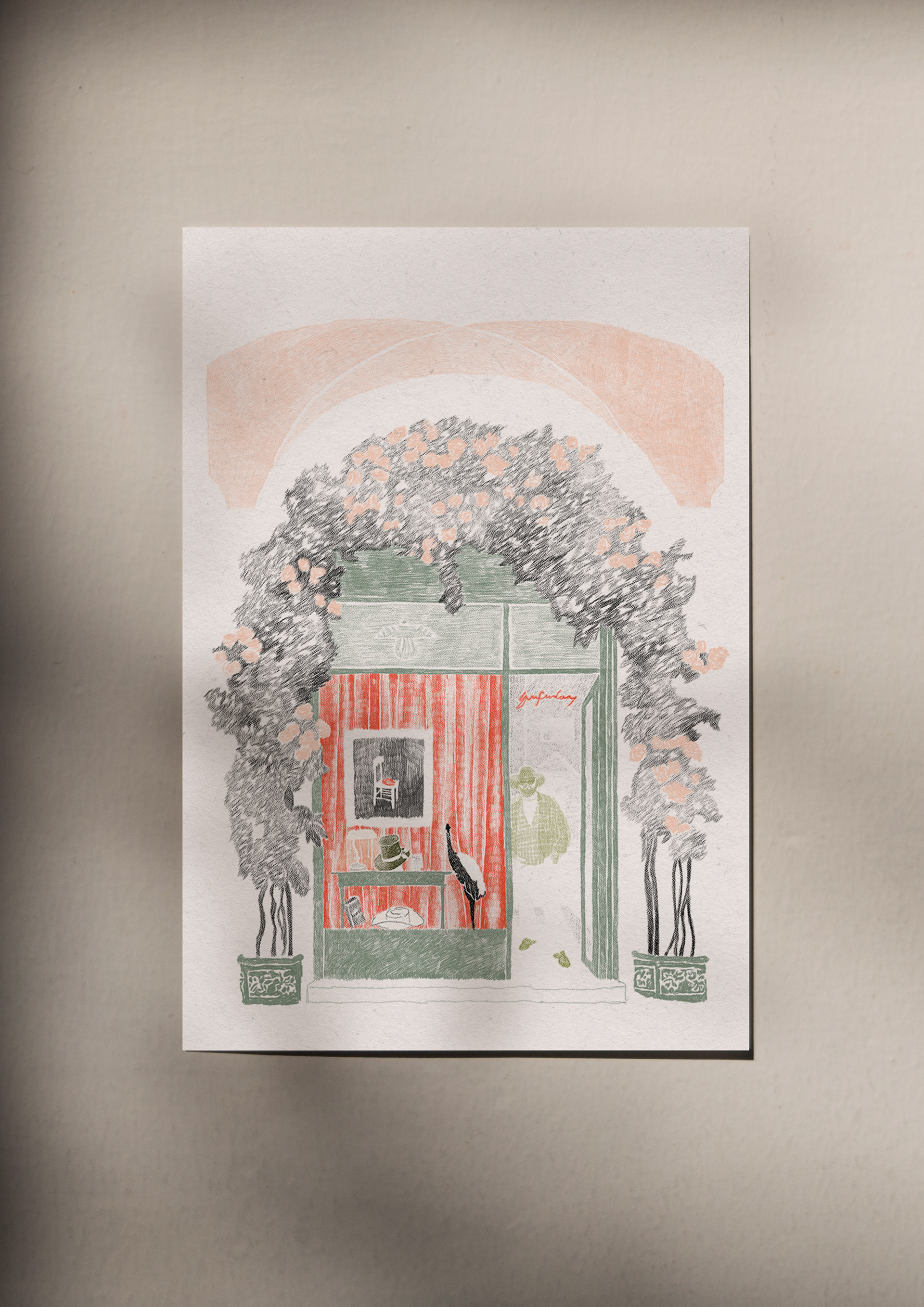 An enchanting hat boutique in central Bologna, it serves as both a hat shop and a hat laboratory. This project involved creating an illustration for a postcard, to be given to clients with their hat purchases.